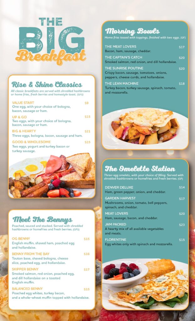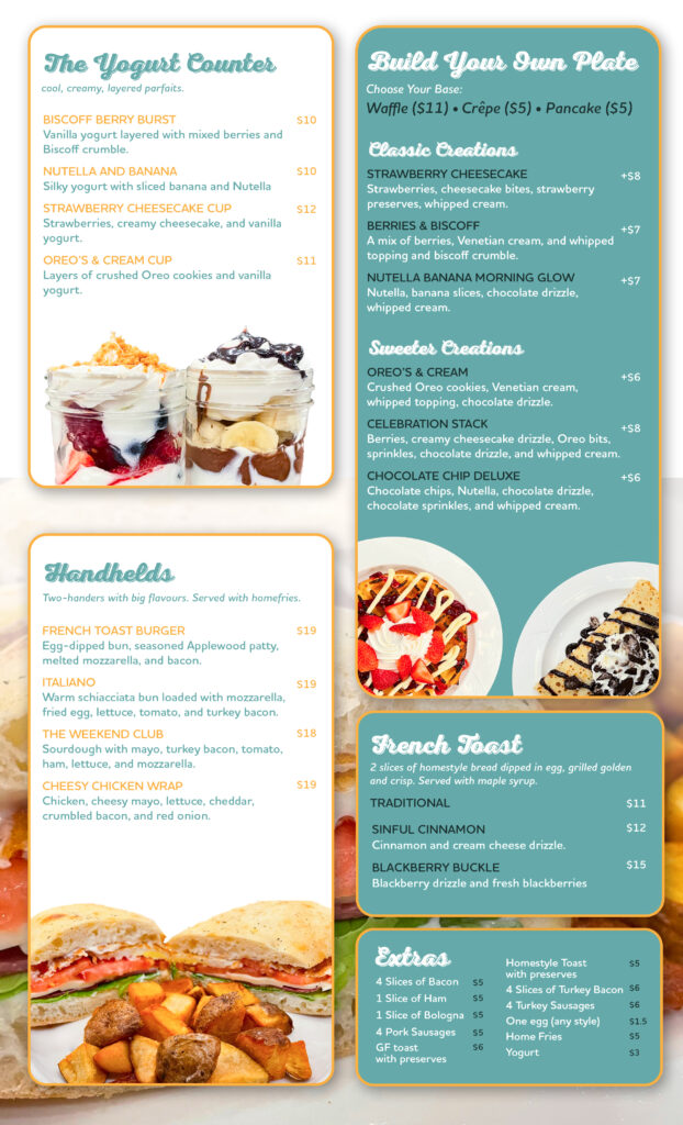 This is a full-on weekend breakfast experience – classic favourites, Bennys, omelettes, sweet creations, mimosas, and comfort-driven dishes made for slow mornings and long brunches.
